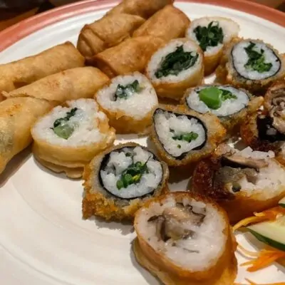 Olha, vou te falar esse rodízio é incrível. Eles usam até cream cheese vegano nos pratos tá? Tudo muito gostoso, muita variedade para além do shitake e shimeji. Dá uma olhadinha nas fotos que é bem auto explicativo. O Zui tem um cardápio gigante de comidas veganas, mas também tem rodízio para não veganos. Casaria nesse restaurante com esse restaurante de tanto que gostei. Rodízio vegano R$99,90 às terças feiras. Aí tem de tudo, harumakis, makimonos, sushis, shitake com abacaxi… Tem até sobremesa, brotheeeer